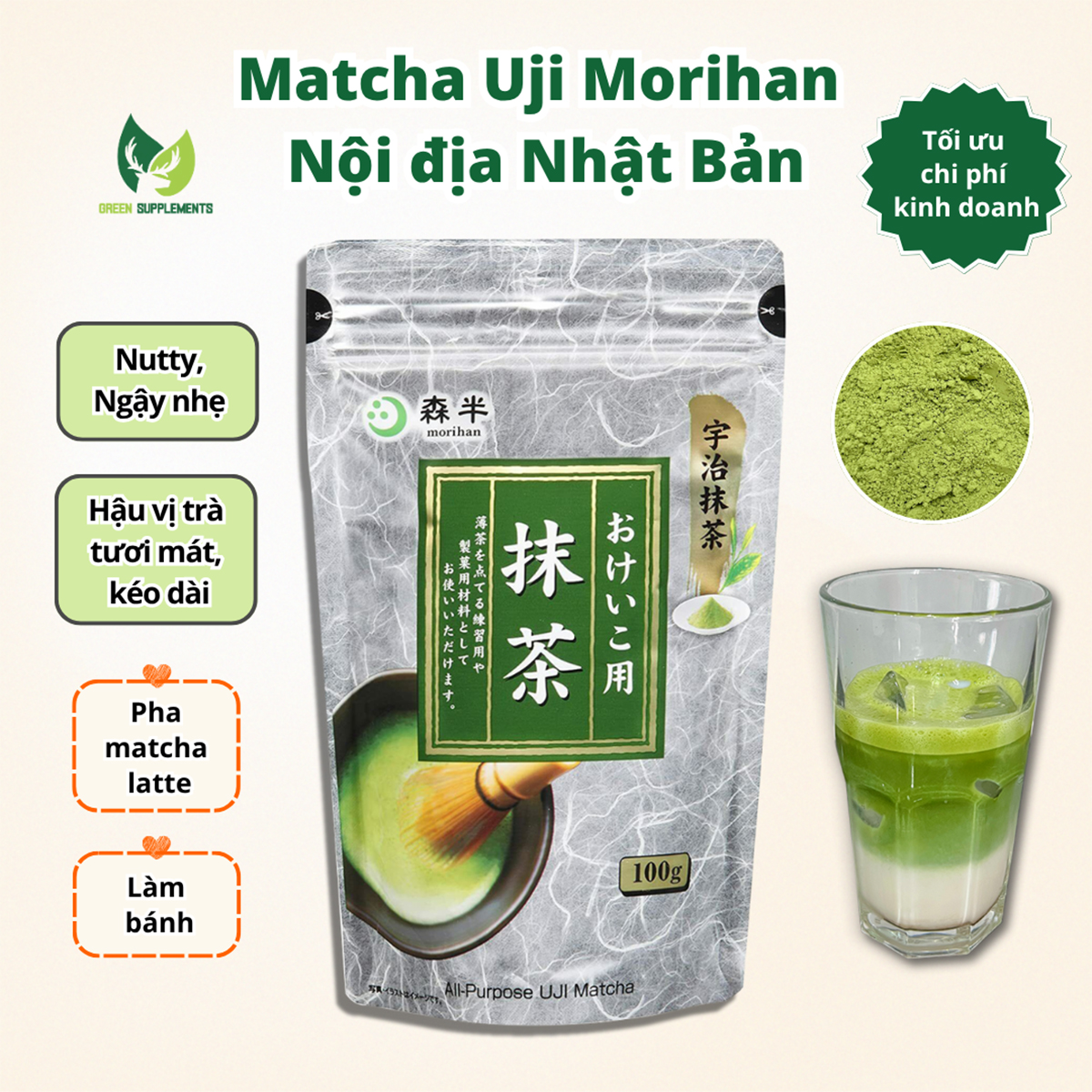 ❖ Bột Matcha Morihan tới từ thương hiệu nổi tiếng Morihan, được sản xuất từ những lá trà tại vùng Uji, nơi được mệnh danh là "thủ đô matcha", thuộc phủ Kyoto, Nhật Bản. Bột trà có vị chát đặc trưng, màu sắc xanh tươi, hương thơm dễ chịu, mang lại cảm giác thư giãn khi sử dụng. Sản phẩm phù hợp để pha các đồ uống matcha cũng như làm nguyên liệu làm bánh hay nấu ăn.