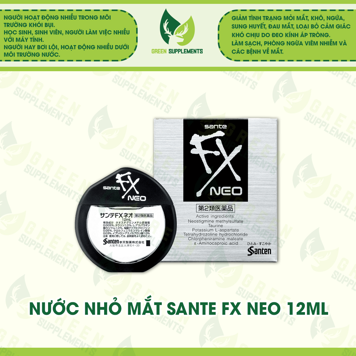 ❖ Nước nhỏ mắt Sante FX Neo giúp làm sạch (rửa mắt) và cắt cơn mệt mỏi, viêm nhiễm, đau mắt ngay tức thì. Sante FX Neo thích hợp dùng cho các bạn học sinh, sinh viên hay những người làm việc nhiều, mắt mệt mỏi, cay mắt hay những người thường xuyên bơi lội dễ bị ảnh hưởng bởi nước hồ bơi.
