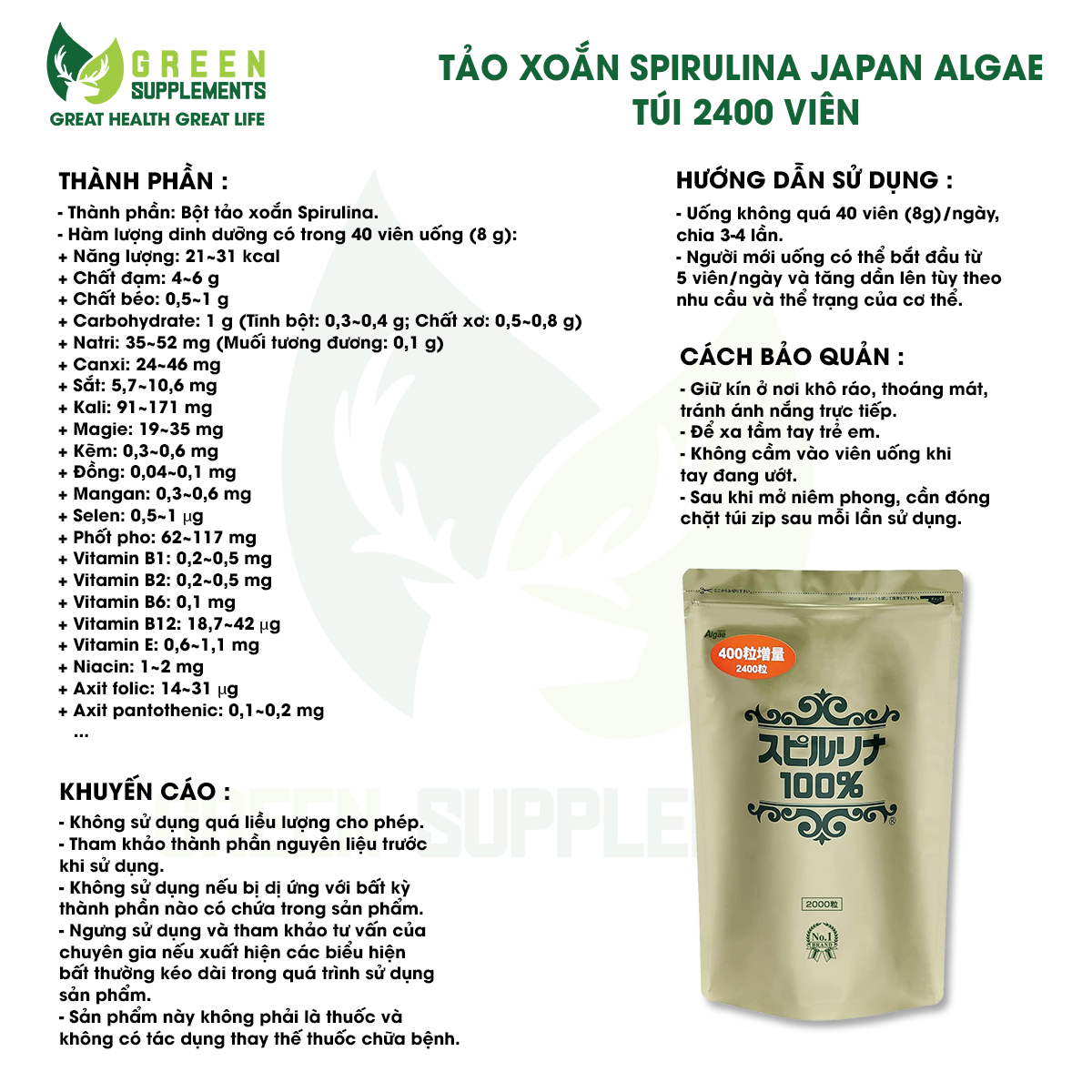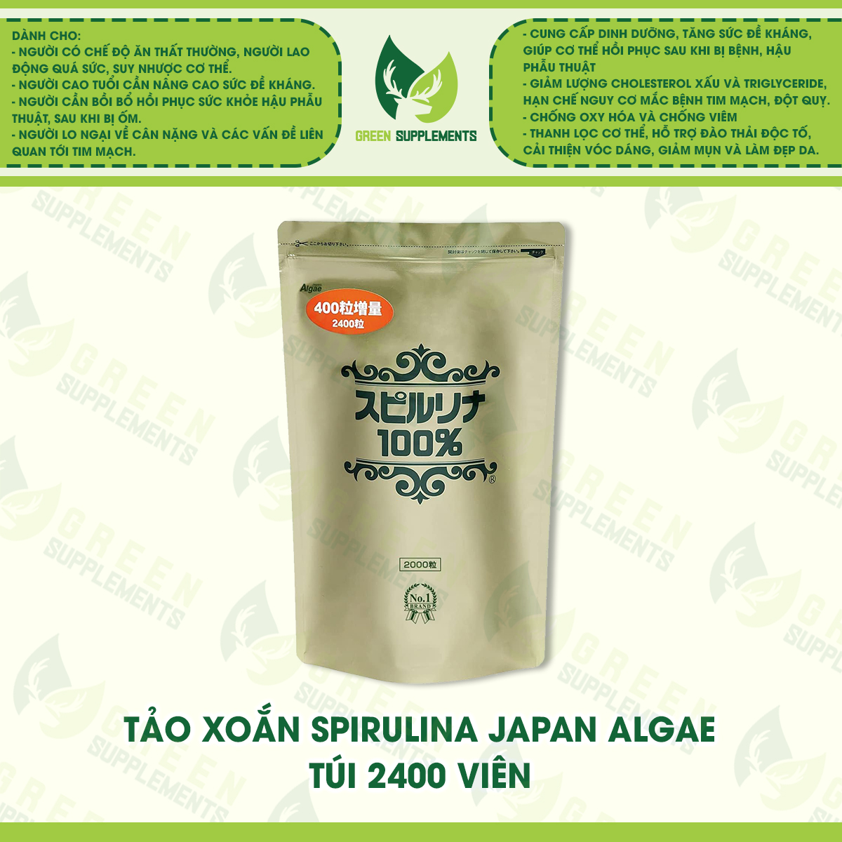 ❖ Viên Uống Tảo Xoắn Spirulina của Nhật Bản có chứa đến 18 loại axit amin, được chiết xuất nguyên chất từ tảo Spirulina tự nhiên, giữ nguyên được toàn bộ dinh dưỡng của tảo xoắn, giúp nâng cao sức đề kháng và hệ miễn dịch cho cơ thể, cung cấp đầy đủ chất dinh dưỡng và vitamin cần thiết cho sức khỏe và làn da, giúp giảm tình trạng béo phì, bảo vệ hệ tiêu hóa, giảm nồng độ cholesterol trong máu, tốt cho hệ tim mạch.