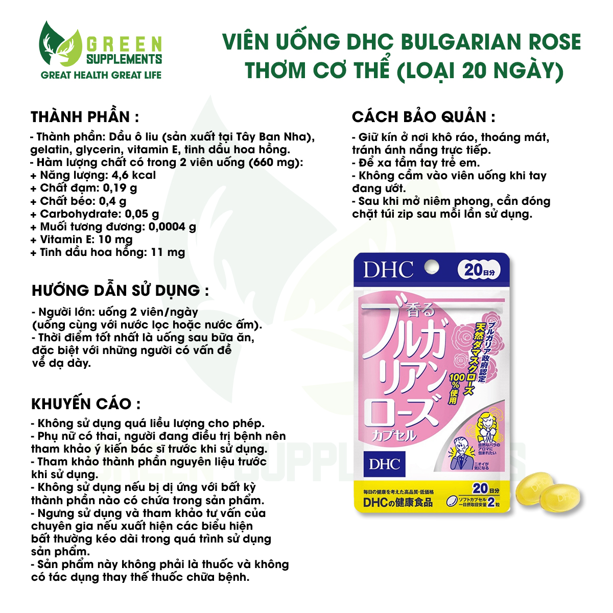 ❖ Mùi cơ thể, mùi hôi miệng khiến chúng ta mất đi phần tự tin trước đám đông. Với tinh dầu hoa hồng được chiết xuất từ 850 bông hoa hồng Bulgaria, viên uống DHC Bulgarian Rose giúp tạo mùi hương hoa hồng hoàn toàn tự nhiên từ bên trong cơ thể.